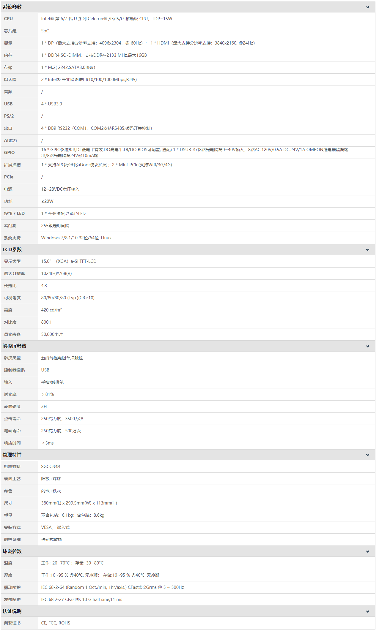 P150RF-E81采用全模具壓鑄成型的鋁合金殼體,使用大面積鋁鰭無風扇散熱設計,保障其堅固機身和高可靠穩定運行。深度的模塊化設計可實現雙Intel千兆網絡或高速隔離IO,以及多IO接口的靈活擴展,更支持CPU核心模塊的快速升級迭代。前面板使用美觀PVC膜和高溫五線電阻式觸摸屏,達到IP65防護等級。實現最小尺寸的標準PCI/PCIe擴展卡的應用支持,寬壓電源輸入、雙隔離485、多路高速USB3.0和高清顯示輸出等特點, 適用于工業4.0、機器視覺、高速運算等多種不同應用場景。