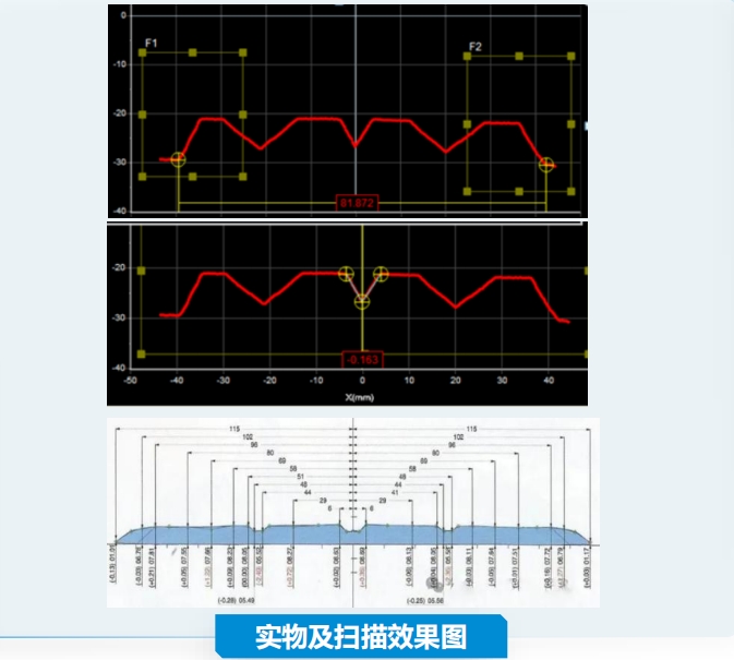 上下各兩個SR7400R,67mm/s,實時采集上下兩個面的輪廓線,在線測量各拐點距離、高度信息。